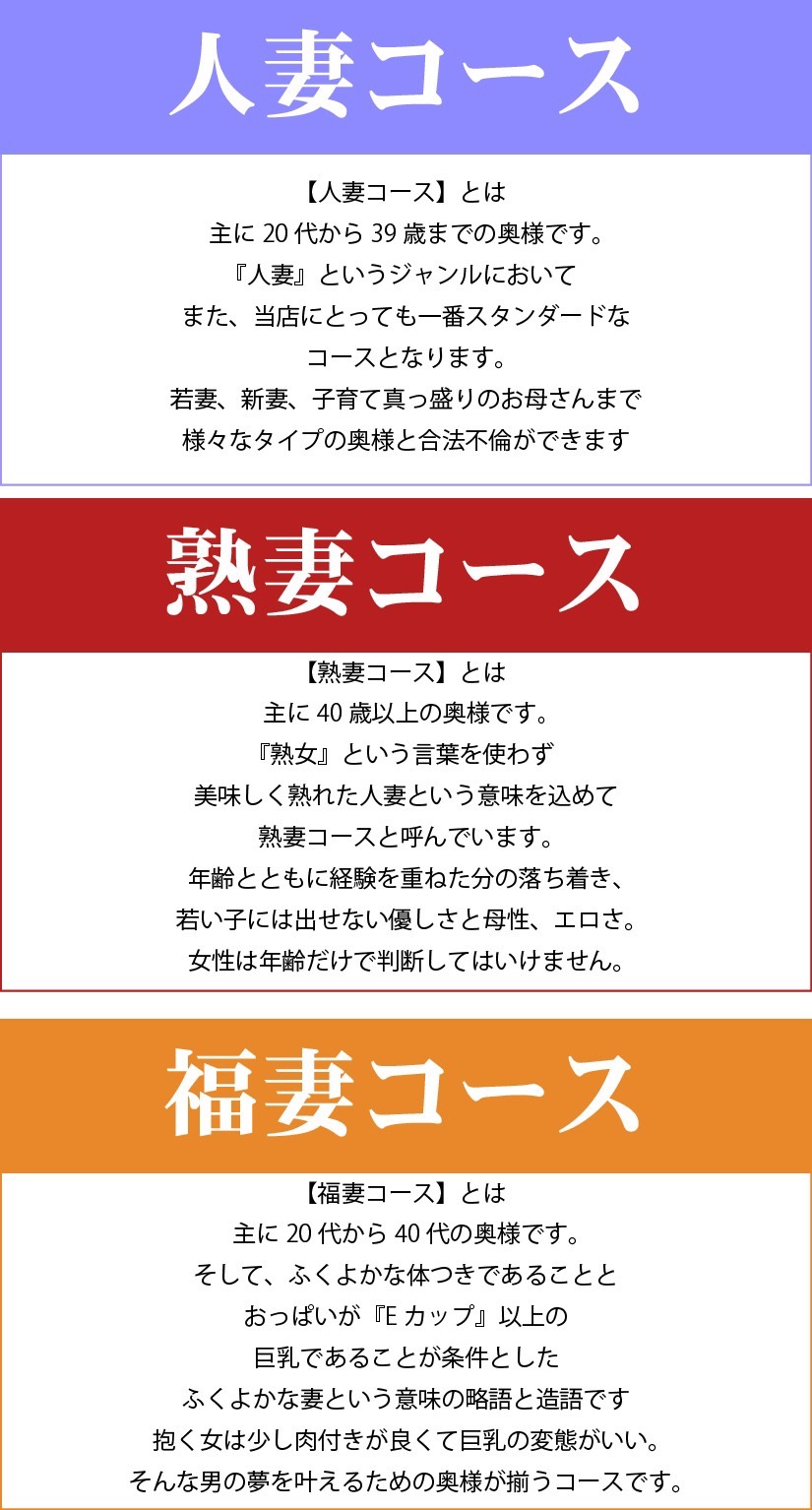 | 熟妻・福妻コース190分 | ¥42,900 | ¥40,700 |